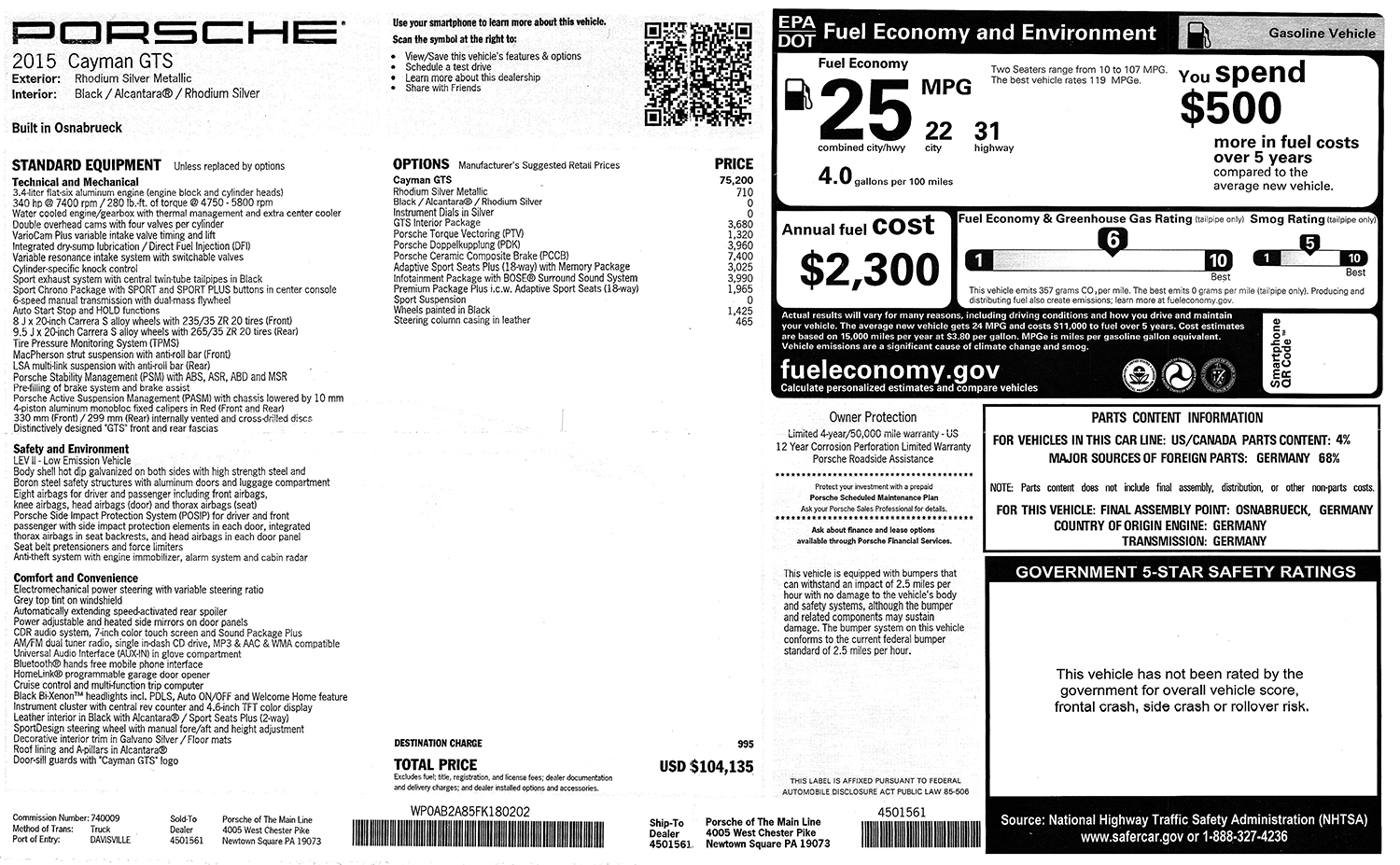 This beautifully optioned and fully loaded Cayman GTS is looking for a new garage to call home! The vehicle was purchased new by the current owner, who simply doesn't have time to drive it as much as he'd like. Sticker price on the car was $104,135.00 (scroll down for original window sticker), so the next owner will be getting quite a deal - saving $13,000 on a fully spec'ed-out GTS. The current owner is a friend of Fabspeed, and has asked for our assistance in listing it for sale. The car is 100% stock at this time, but could easily be upgraded with Fabspeed performance products for the new owner if you so desire.