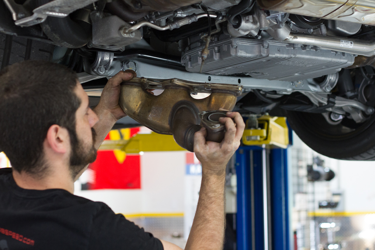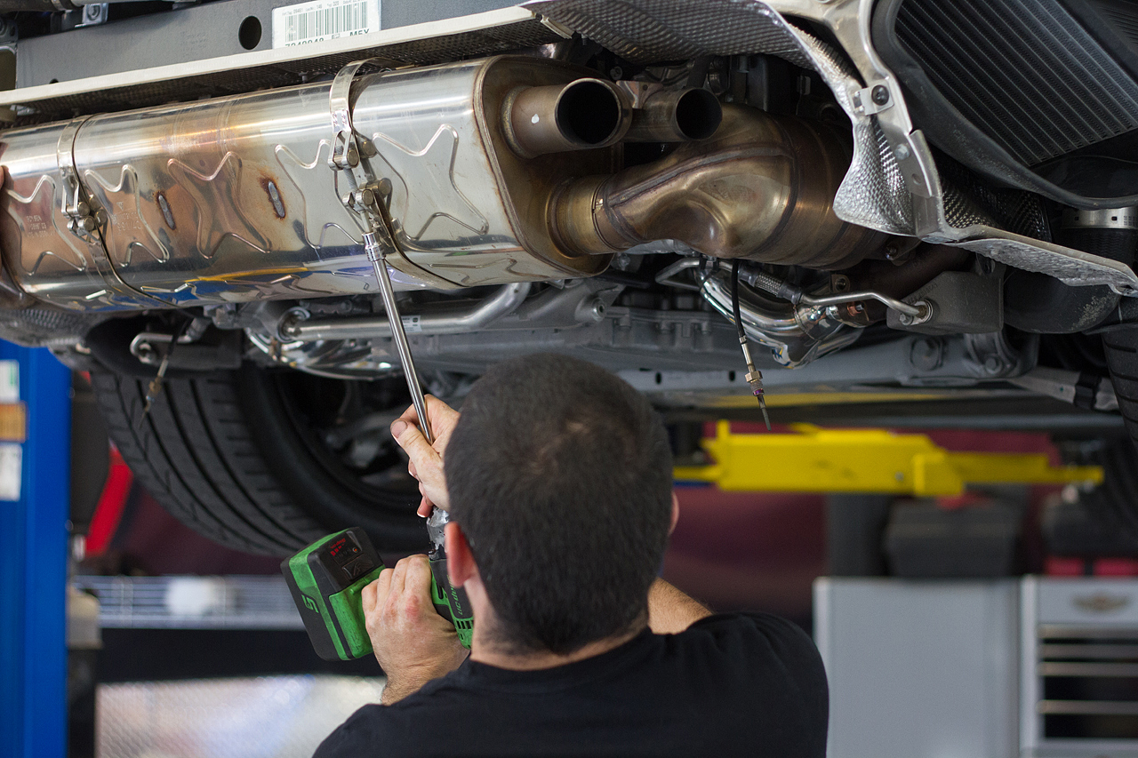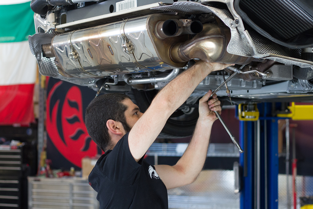 Then it was up on the lift as surgery began to remove the factory exhaust components.