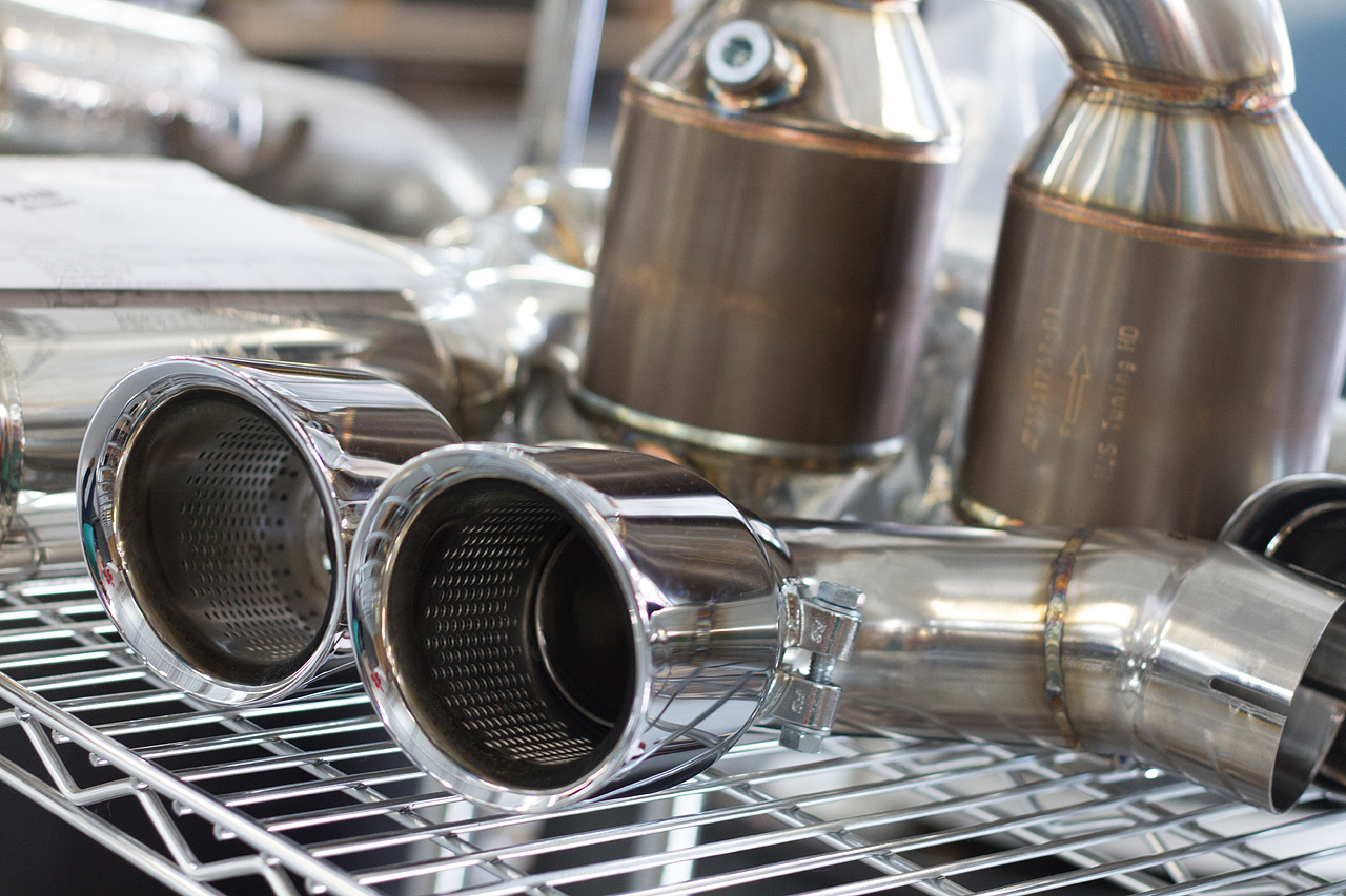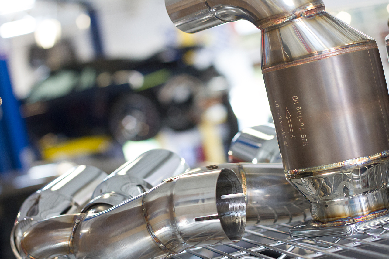 Next, the heavy factory rear muffler and restrictive catalytic converters were removed so that the Supersport X-Pipe and 200-cell HJS Sport Cats could be installed.